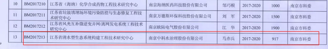 2017年11月,江蘇省科學(xué)技術(shù)廳將“江蘇省工程技術(shù)研究中心”建設(shè)項(xiàng)目下達(dá)給222家單位,南京中科水治理股份有限公司承擔(dān)“江蘇省清水型生態(tài)系統(tǒng)構(gòu)建工程技術(shù)研究中心”建設(shè)工作。