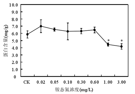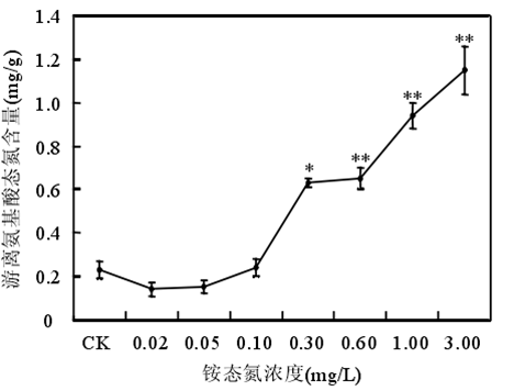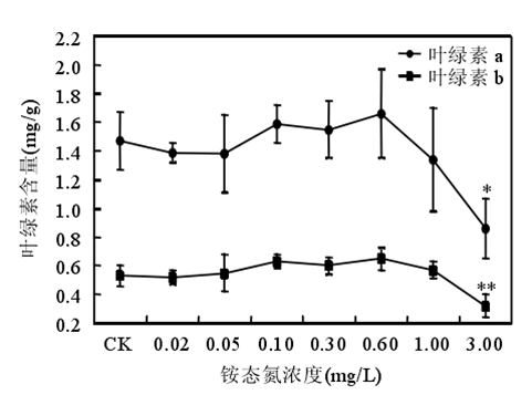 銨態(tài)氮濃度低于 0.60mg/時(shí)苦草生長(zhǎng)良好,濃度大于或等于 1.00mg/L 時(shí)苦草的光合能力受到抑制、代謝受到干擾。苦草對(duì)銨態(tài)氮最敏感的生理生化指標(biāo)是葉片中游離氨基酸態(tài)氮含量。銨態(tài)氮作為沉水植物的一種營(yíng)養(yǎng)物質(zhì),當(dāng)其含量較低時(shí),植物由于營(yíng)養(yǎng)缺乏誘導(dǎo)產(chǎn)生自由基。