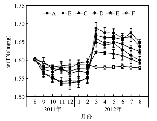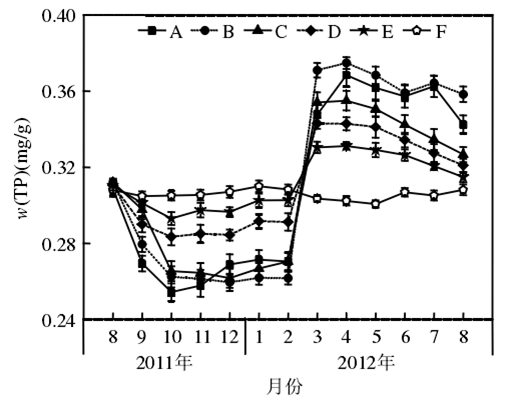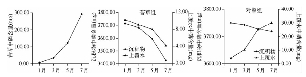 苦草對(duì)水體營(yíng)鹽的去除率隨生物量的增加不斷增大,當(dāng)生物量達(dá)到 2380.00g時(shí),去除率放緩。苦草腐敗釋放的磷大部分被底泥吸附,少量進(jìn)入水體。草腐敗分解具有階段性,前36d分解迅速,以后分解速率顯著下降。