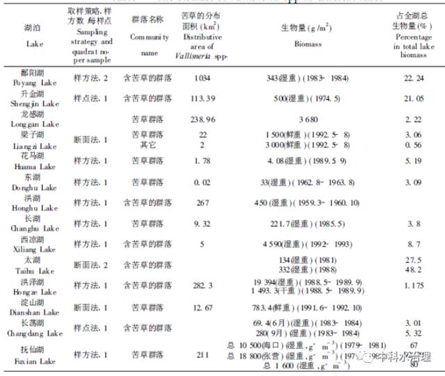 在很多湖泊植被調(diào)查工作中都對(duì)苦草群落或含苦草的群落生物量進(jìn)行了測(cè)定(見(jiàn)下圖)。從表中可以看出,最高和最低生物量之間存在上千倍的差異。這一方面是因?yàn)檎{(diào)查對(duì)象尚包括其它種類,而非苦草本身; 另一方面,也是由于調(diào)查方法本身所致: