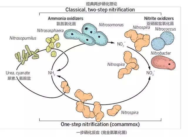 這個理論最先是由俄國微生物界傳奇維諾格拉斯基 (Sergei Winogradsky)早在19世紀末“成功”展示,他分離出了負責這兩步硝化的微生物,也就是所謂的AOB(ammonia oxidizing bacteria)和NOB(nitrite oxidizing bacteria)。但這個超過100年歷史的教條在2015年圣誕節(jié)前被英國明星科學雜志《自然》上的兩篇同日發(fā)表的題目雷同的文章和隨后一篇在美國微生物學會的文章終結了。三個科學團隊發(fā)現(xiàn)了三種不同的培養(yǎng)[1,2]和一種非培養(yǎng)細菌[3]能夠各自進行從氨氮到硝態(tài)氮的完全硝化過程。