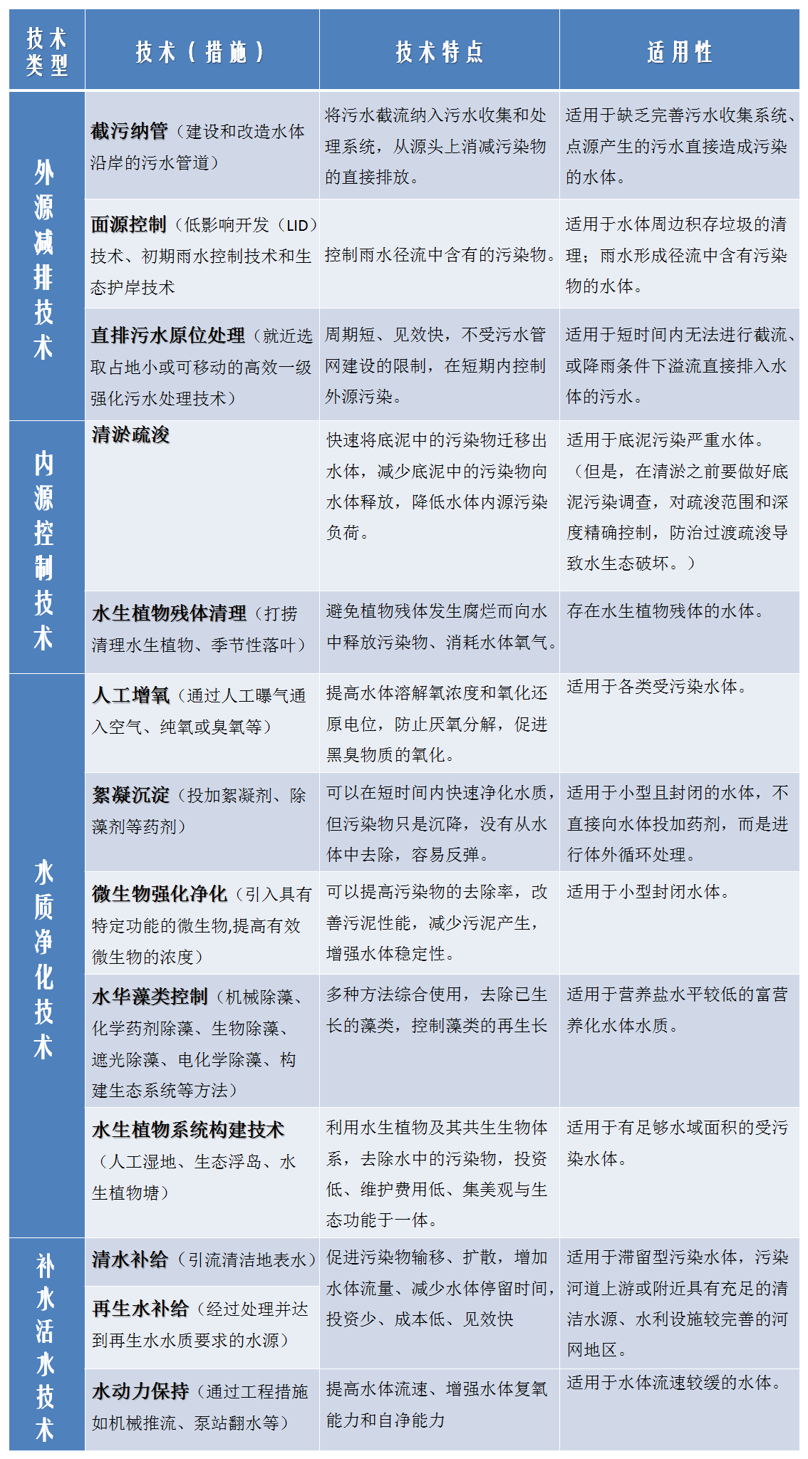 不同的治理技術(shù)具有不同的特點(diǎn)和使用范圍,沒有“萬能型”的技術(shù),需要根據(jù)水體污染的程度、污染的原因和治理階段的不同,優(yōu)先選擇適用技術(shù),而不是所謂的“新”技術(shù)。現(xiàn)在,就讓我們來看一看怎么對(duì)癥下藥吧!