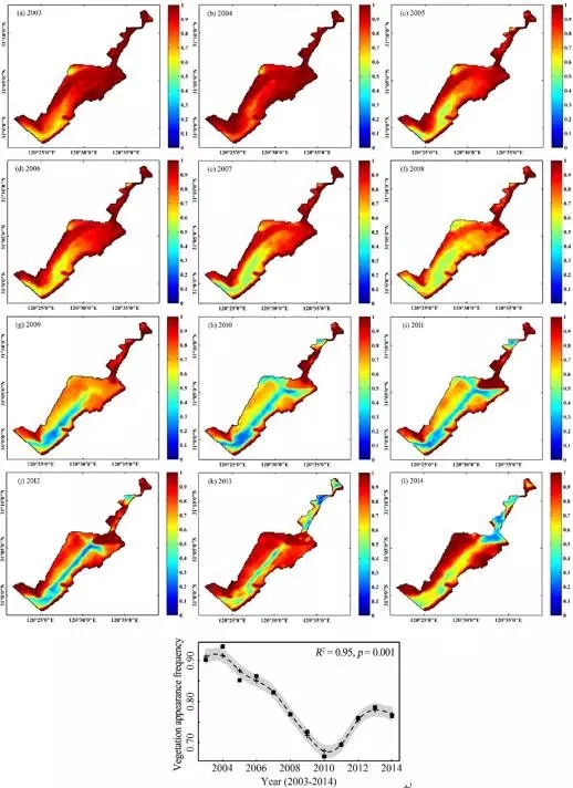 2003-2014年東太湖水生植物出現(xiàn)頻次空間分布和長期變化
